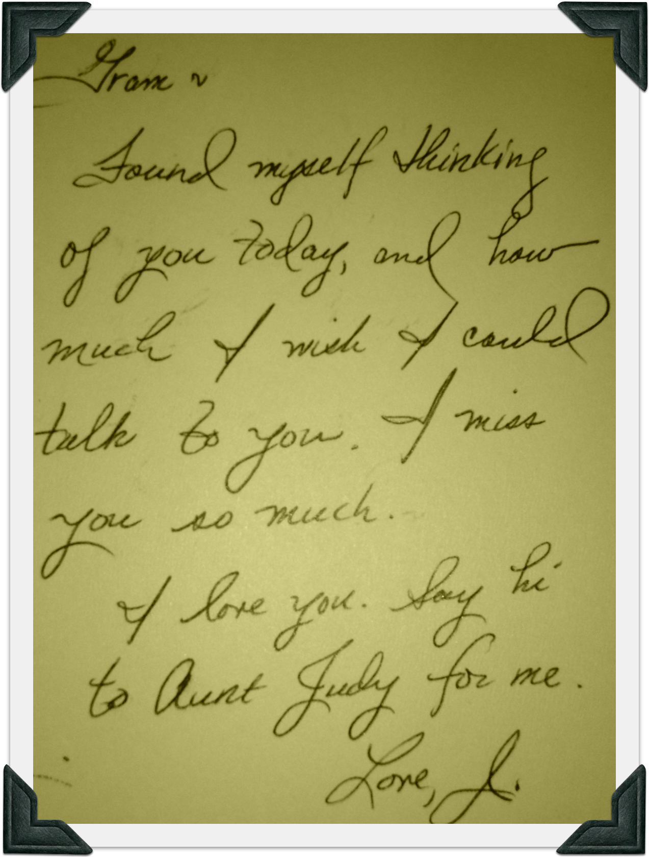 Written on a legal pad, with black felt pen, on both sides, Gram would write in flowing script of the weather, the neighbors, books, and her hopes for me. I remember tearing into those letters feverishly, and how each one felt like a present. Each one held promise – and occasionally some cash.